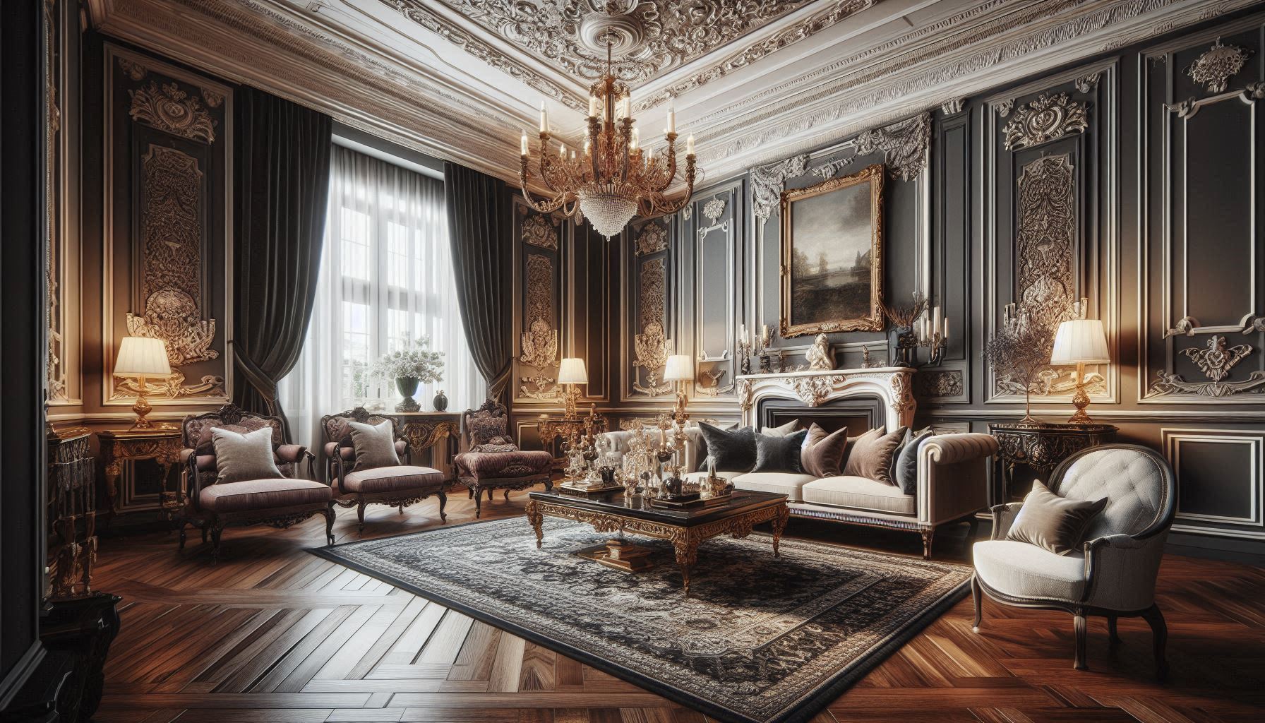 Trần nhà thường được trang trí bằng các chi tiết chạm trổ hoặc hoa văn công phu. Bên cạnh đó, kiến trúc cũng thường điểm thêm bằng đèn chùm lớn, tranh vẽ cổ điển. Bên cạnh đó, các tấm gương lớn với khung trang trí cũng là một trong những yếu tố không thể thiếu. Các phụ kiện trang trí như tượng điêu khắc, bình hoa, và các vật dụng bằng kim loại quý như đồng, vàng.